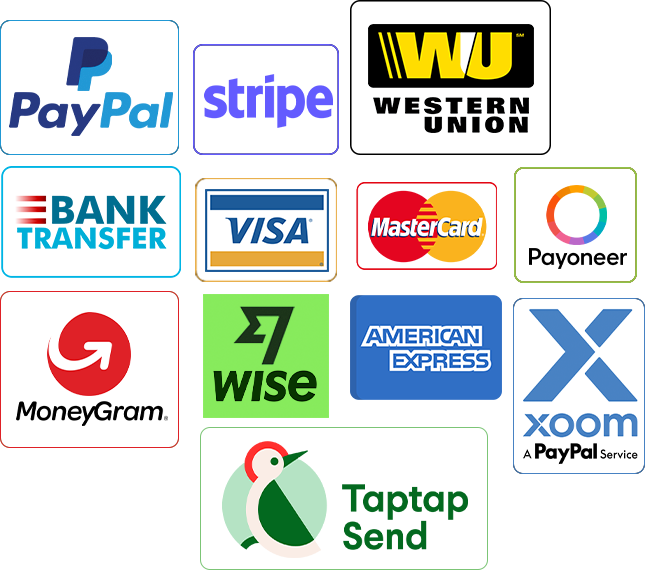 We support multiple payment options including PayPal, Stripe, Visa, MasterCard, American Express, Payoneer, Bank Transfer, Western Union, MoneyGram, Xoom, and Taptap Send, making global payments easy and convenient.